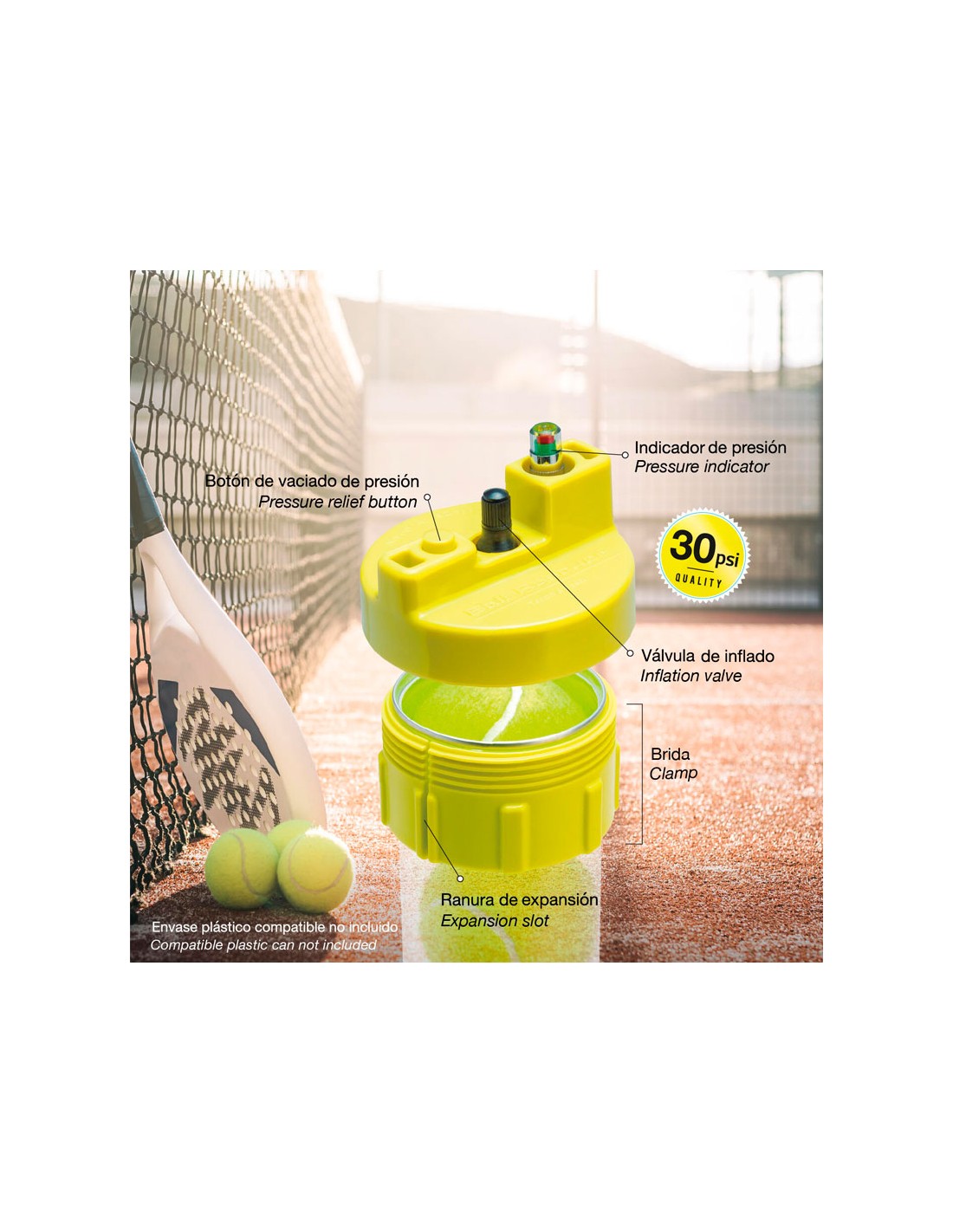 Bei diesem Produkt handelt es sich um ein Drucksystem, das an Kunststoffbehälter angepasst werden kann, die für die Aufnahme von drei oder vier Padel-, Tennis- und Racquetballbällen verschiedener Marken ausgelegt sind . Sein Hauptmerkmal ist die Möglichkeit, die Kugeln mit dem gewünschten Druck zu lagern, was ihre Lebensdauer um das Zehnfache verlängern kann. Darüber hinaus verfügt es über die Fähigkeit, drucklose Bälle wiederherzustellen und so eine konstante Leistung sicherzustellen.