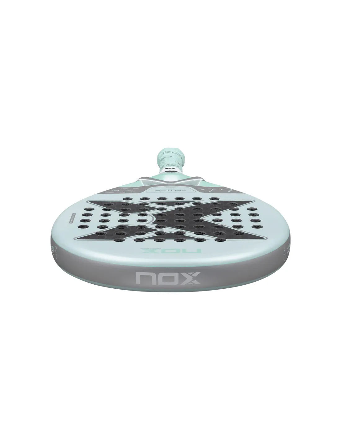 In terms of comfort, the Nox Ventus Hybrid 12K Lite 2026 padel racket features EOS Tunnel, lateral perforations that improve aerodynamics and optimize weight distribution, making the racket faster and more precise. The Pulse System reduces vibrations transmitted to the arm, while Nox Custom Grip® technology, certified by Testea Padel, increases grip and reduces vibrations. Finally, the SmartStrap system allows for quick and easy grip changes, providing added hygiene and customization.