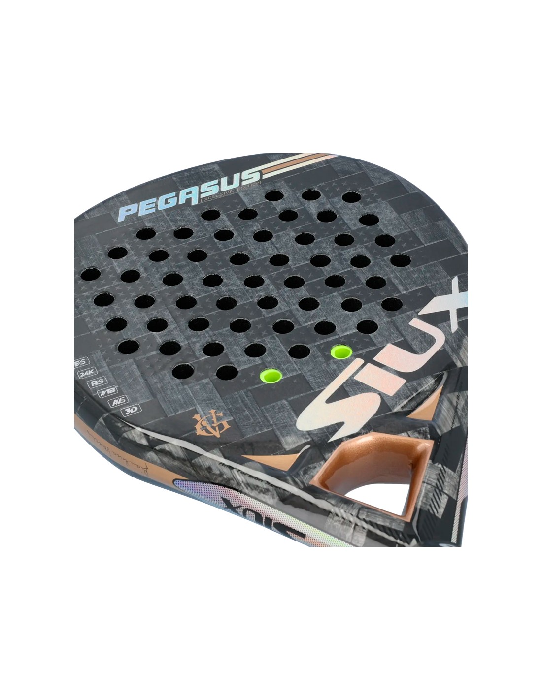 The Siux Pegasus GV Edition Padel Racquet offers a perfect combination of power, control and precision, ideal for intermediate to advanced level players looking for superior performance. With its 24K Silver carbon surface, this racket guarantees an impressive ball output and a quick response, while its Soft EVA core improves comfort and reduces vibrations to protect the arm with every hit.