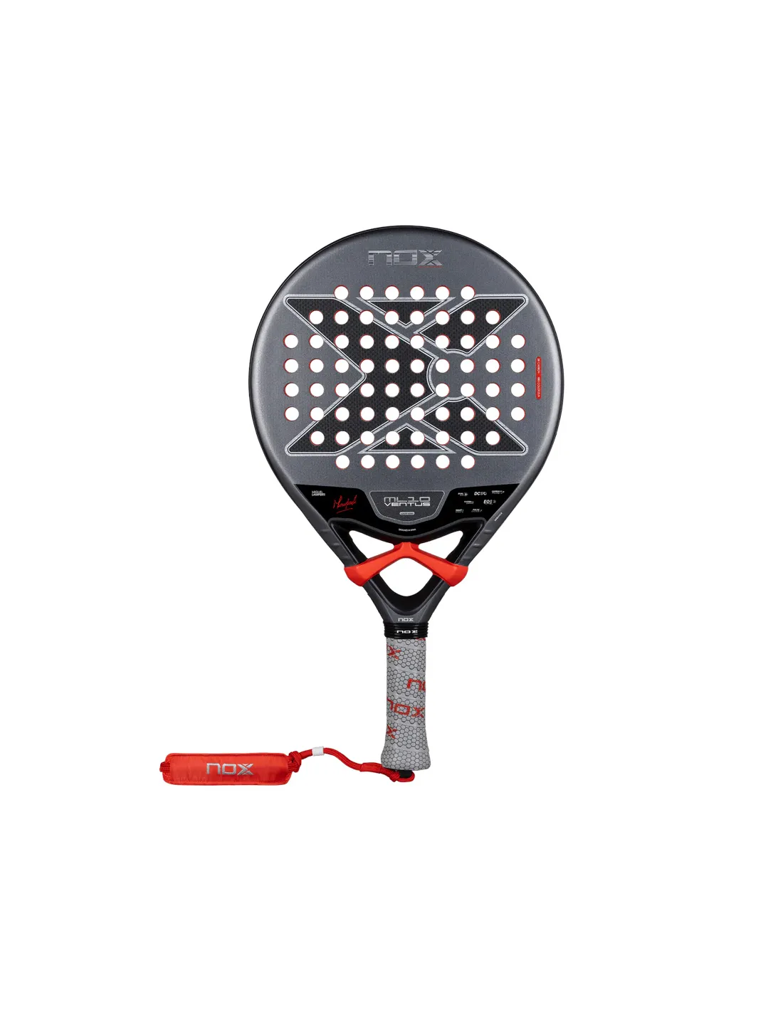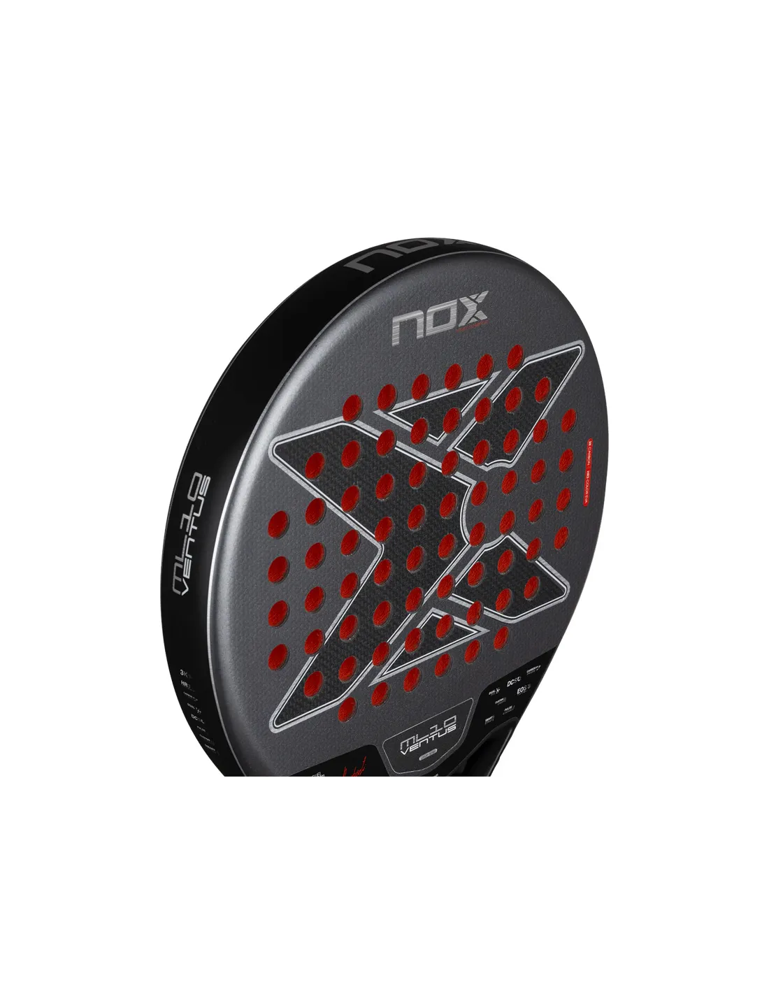 La pala de pádel Nox ML10 Ventus Control 3K 2026 incorpora las tecnologías más avanzadas de NOX. El marco de carbono (Carbon Frame) refuerza la rigidez y durabilidad de toda la pala, mientras que la superficie Dual Spin, que combina textura 3D y acabado arenado, amplía el espectro de efectos sin comprometer la durabilidad. El sistema Dynamic Composite Structure (DCS) añade más material desde el marco hacia el interior de la cara, reduciendo el riesgo de rotura de fibras en golpes descentrados.