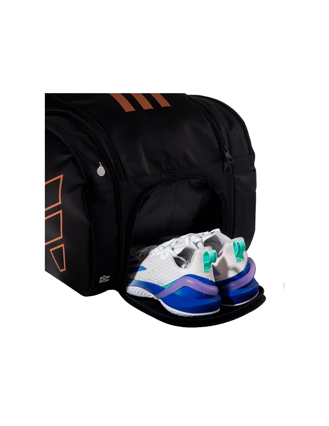 La capacidad es uno de los puntos fuertes de este paletero preparado para cargar con hasta 10 palas. Los apartados laterales están hechos para llevarlas sujetas y aislarlas térmicamente para evitar su deterioro. En el compartimento principal hay espacio para todo. Y en los cuatro bolsillos exteriores, para los objetos más pequeños. Las zapatillas tienen también su lugar hecho de tejidos transpirables. Todo tiene su sitio y está fabricado con los mejores materiales en cuanto a calidad y durabilidad.