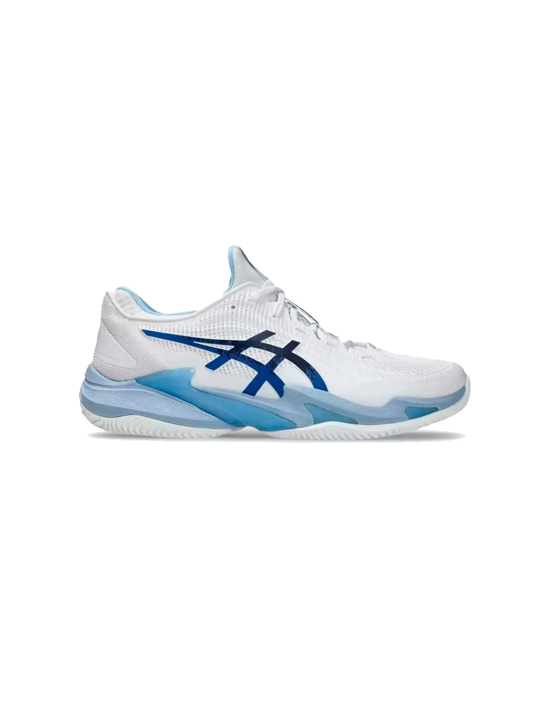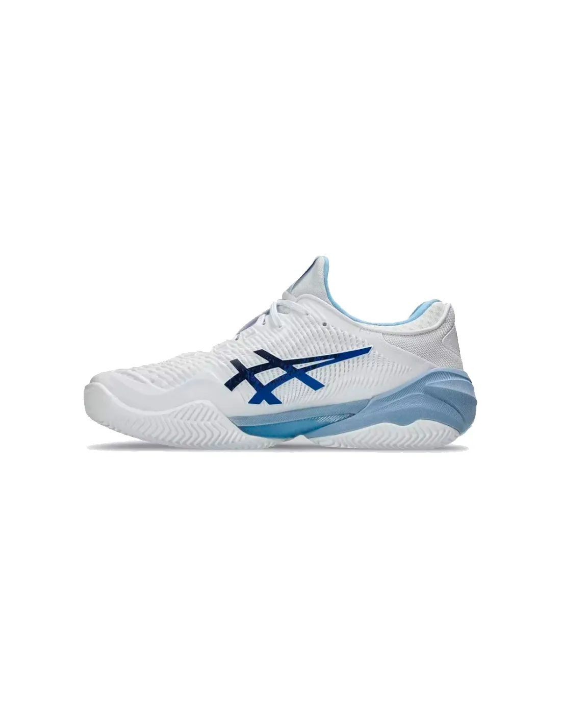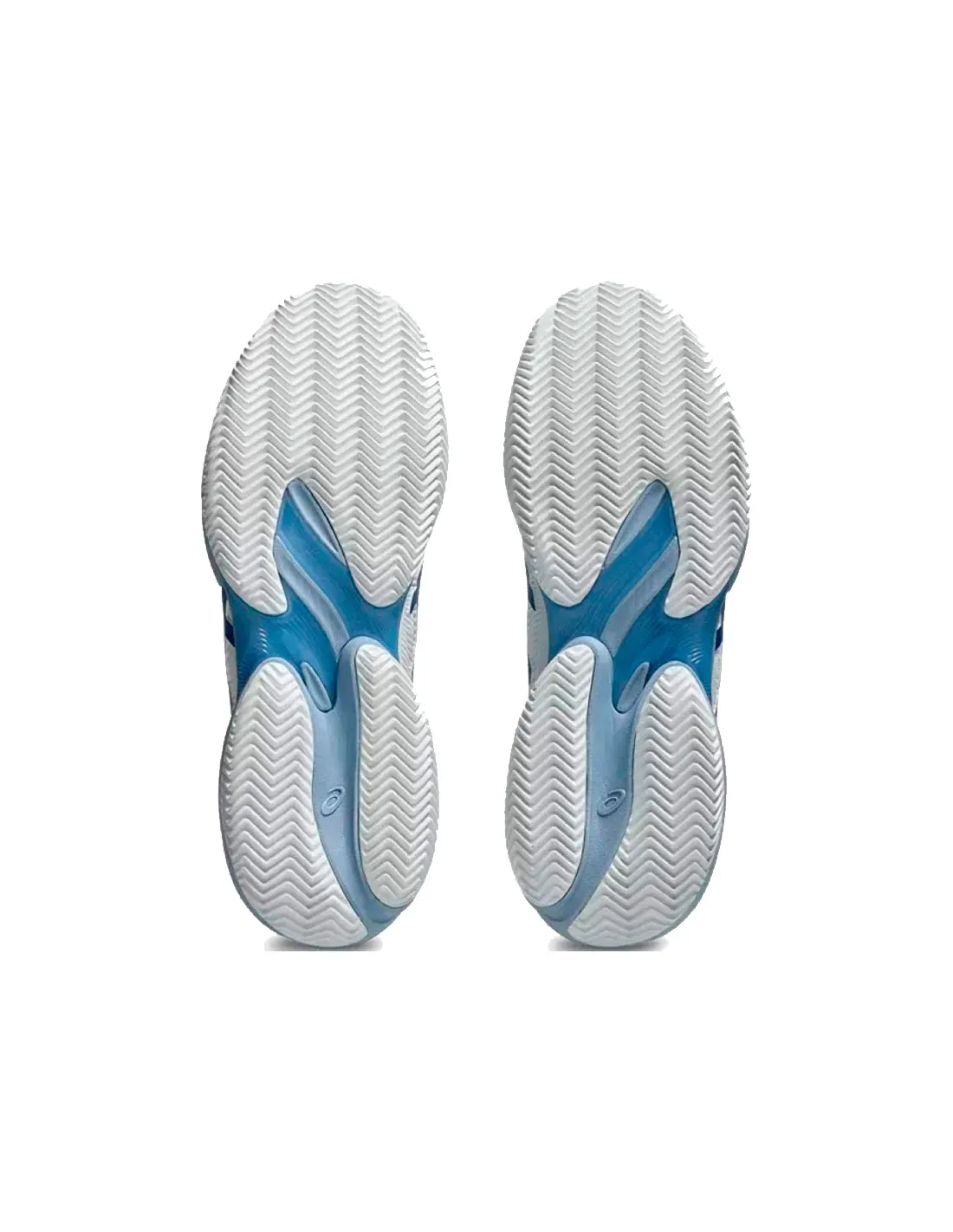 Asics Court FF 3 Novak Clay Blanco Azul Tuna: zapatillas de alto rendimiento con tecnología FlyteFoam y suela específica para polvo de ladrillo. Respaldadas por Novak Djokovic.