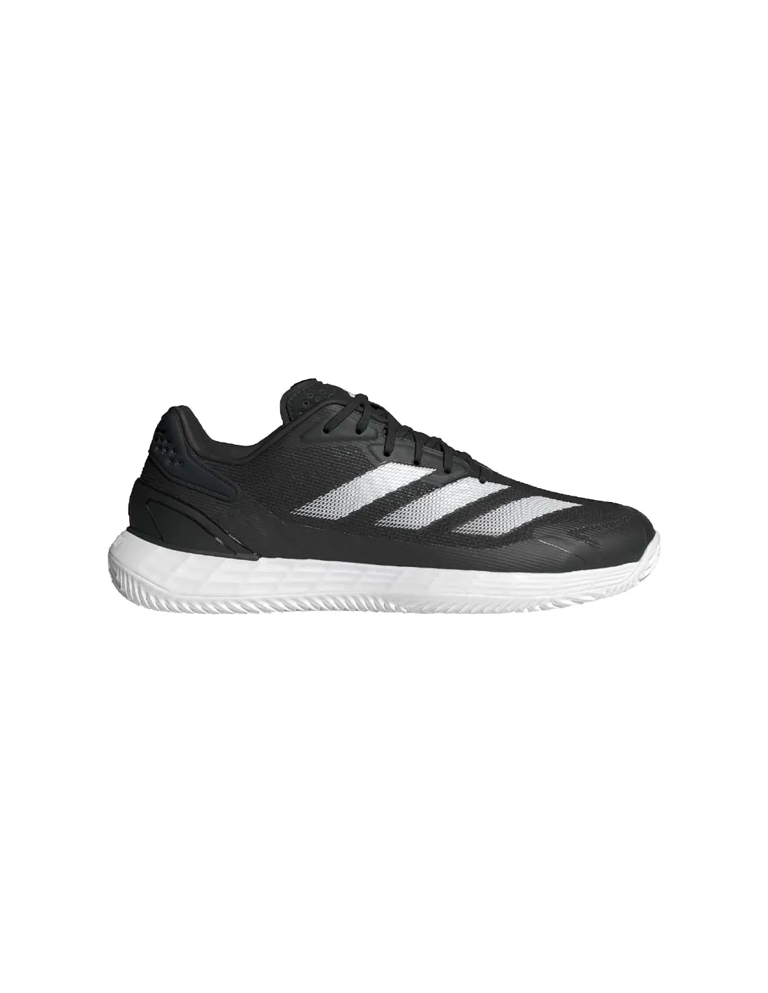 La chaussure Adidas Defiant Speed 2 Clay, en noir, blanc et gris, offre vitesse, stabilité et confort sur les courts en terre battue, avec une semelle extérieure en terre battue à haute adhérence et une conception légère destinée aux joueurs rapides et agressifs.