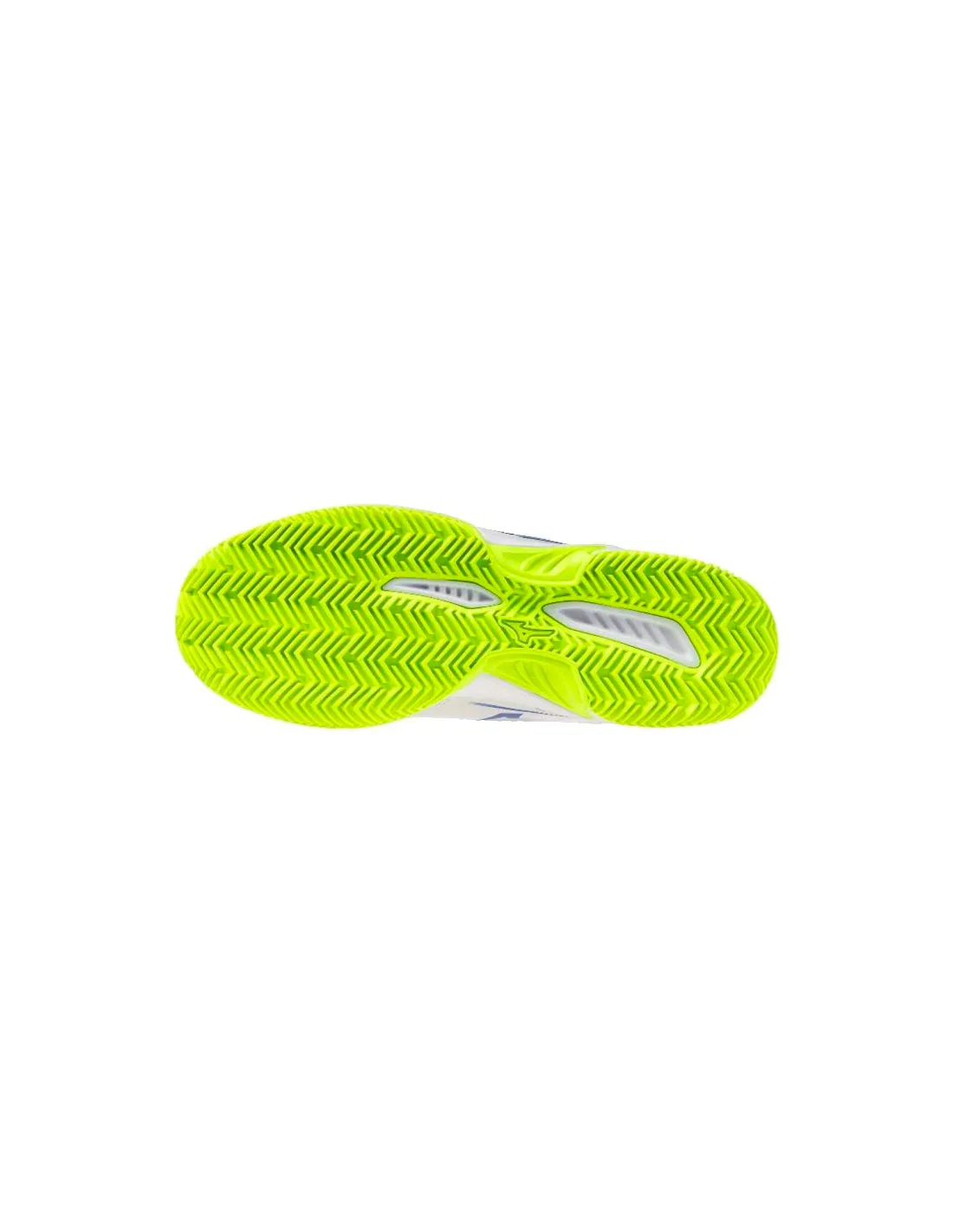 Chaussures de padel Mizuno Break Shot 5 pour terre battue, blanches et bleues, conçues pour offrir confort, stabilité et une adhérence optimale sur les courts en terre battue. Idéales pour les joueurs recherchant performance et style à chaque match.