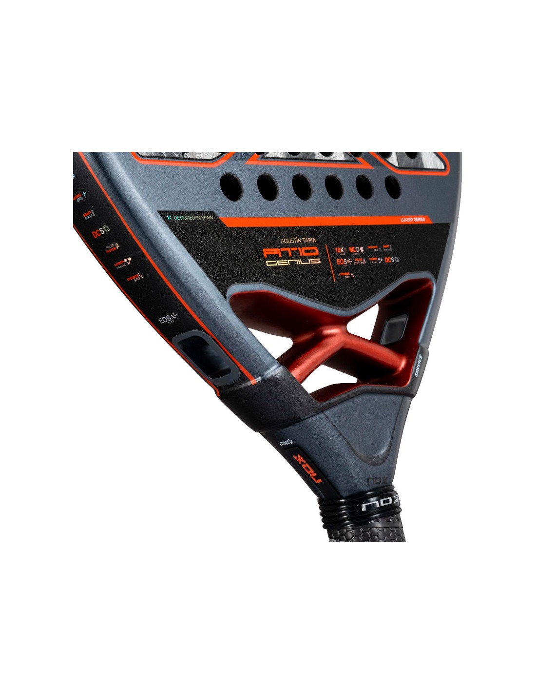 Construite avec du carbone Alum 18K et un noyau MLD Black Eva , cette raquette de padel Nox AT10 Luxury Genius 18K Alum 2025 d'Agustín Tapia offre une sensation de frappe confortable avec une dureté intermédiaire. Le carbone aluminisé offre non seulement de la solidité, mais améliore également la résistance aux variations de température, maintenant ainsi des performances constantes dans toutes les conditions. De plus, la technologie EXCLUSIVE SPIN avec une double finition rugueuse (hexagonale 3D au centre et texture sable dans le reste) permet un contrôle total et une plus grande capacité à ajouter de l'effet à la balle.