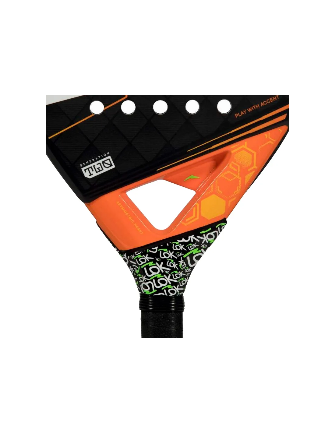 Le cœur asymétrique exclusif, signature de Lok, garantit un équilibre optimal, une rigidité structurelle supérieure et une stabilité exceptionnelle. Sa conception asymétrique amplifie la puissance du swing, augmentant la vitesse de la balle sans compromettre le contrôle, même sur les coups les plus exigeants.