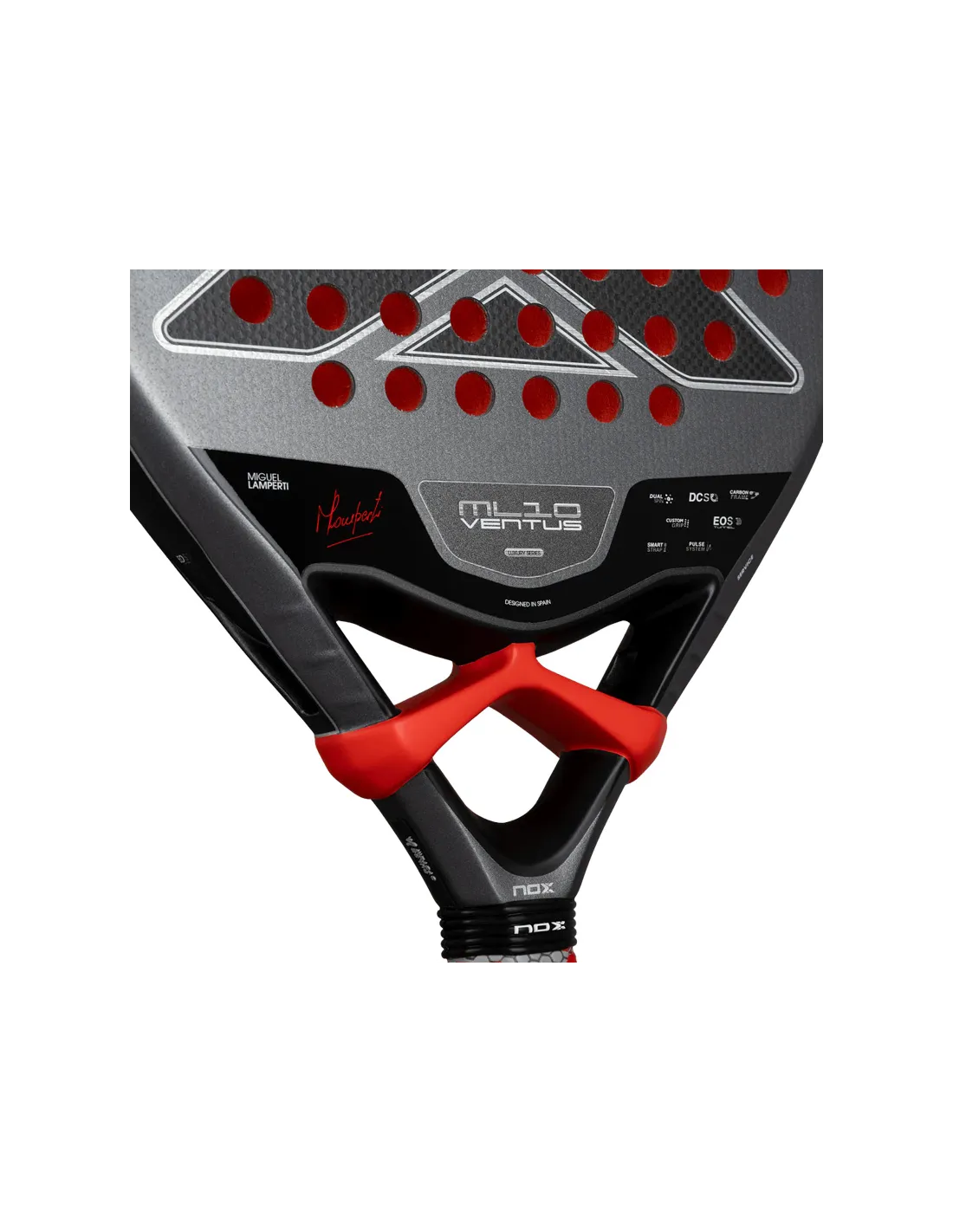 The Nox ML10 Ventus Control 3K 2026 padel racket incorporates NOX 's most advanced technologies. The carbon frame reinforces the rigidity and durability of the entire racket, while the Dual Spin surface, which combines a 3D texture and sandblasted finish, expands the spectrum of effects without compromising durability. The Dynamic Composite Structure (DCS) system adds more material from the frame to the interior of the face, reducing the risk of fiber breakage on off-center hits.