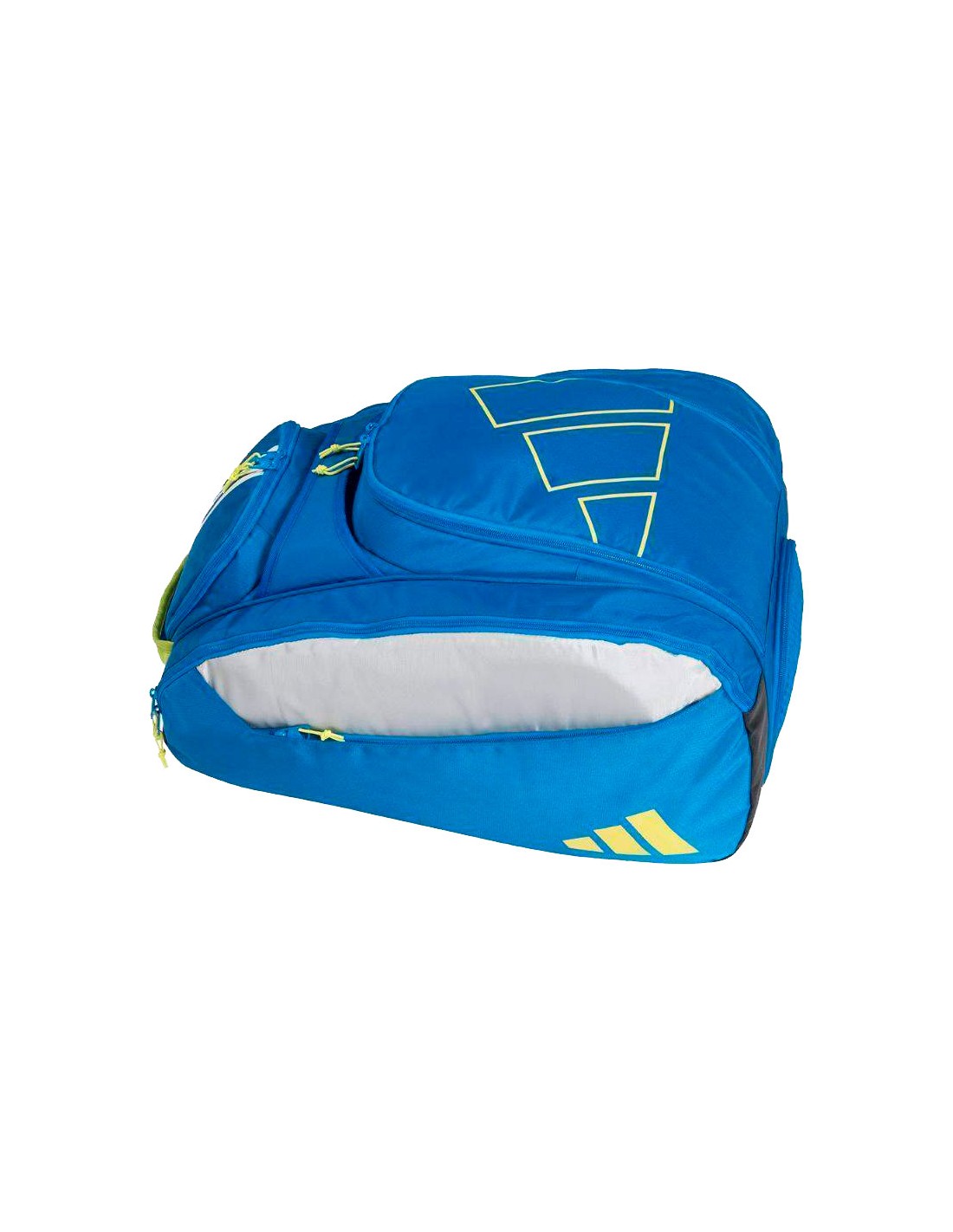 La borsa da padel Adidas Multigame 3.3 Blu è progettata per trasportare tutto ciò di cui un giocatore di padel ha bisogno. La sua ampia tasca centrale ti permette di riporre comodamente tutta la tua attrezzatura. I due scomparti laterali sono per le racchette e hanno un rivestimento termoisolante per proteggerle. Sotto lo scomparto centrale è presente uno spazio in rete studiato appositamente per le scarpe, facilitando la traspirazione . Inoltre, per i piccoli oggetti, la borsa per racchette è dotata di tre tasche: una su ciascun lato e una terza sulla parte superiore, garantendo un'organizzazione ottimale e un facile accesso.