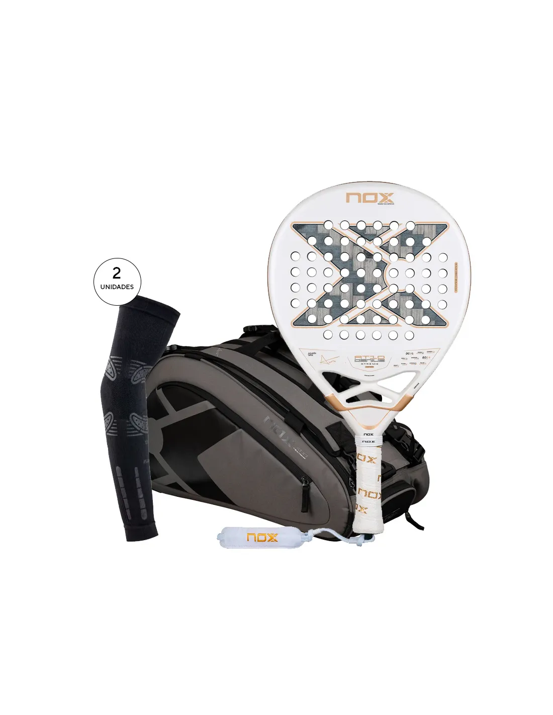 Pacchetto padel premium con racchetta Nox AT10 Genius Alum 12K, borsa ufficiale per racchetta AT10 e custodia di compressione Floky, pensato per giocatori esigenti che cercano prestazioni e comfort.