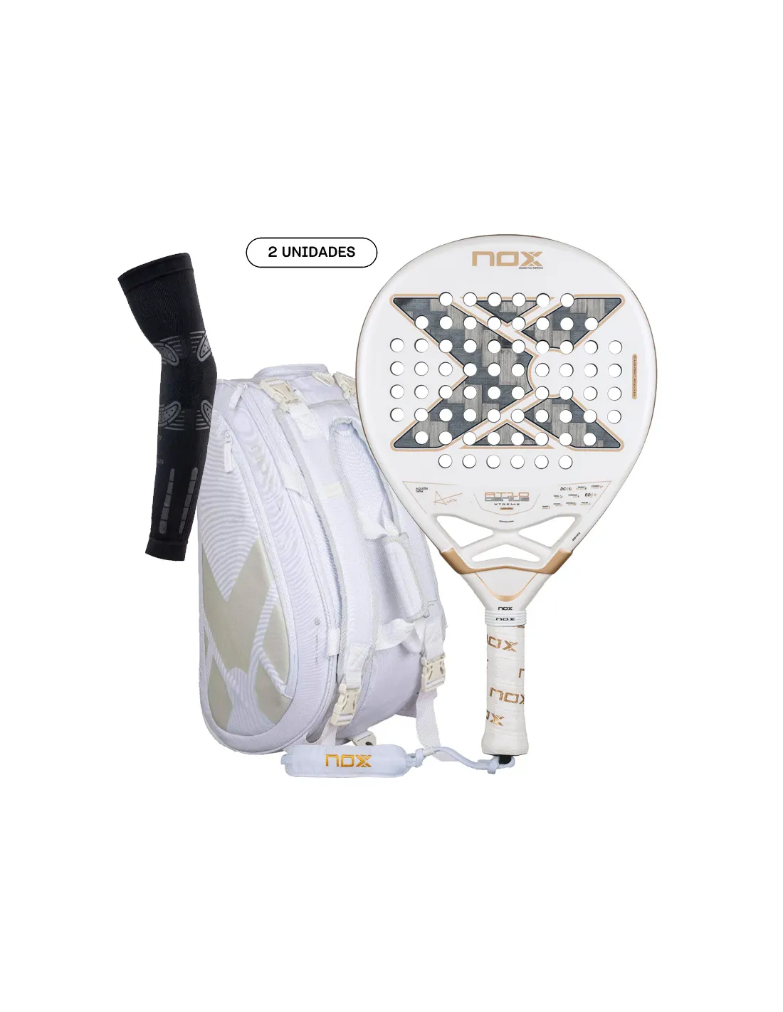 Pacchetto padel premium con racchetta Nox AT10 Genius Alum 12K, borsa ufficiale per racchetta AT10 e custodia di compressione Floky, pensato per giocatori esigenti che cercano prestazioni e comfort.