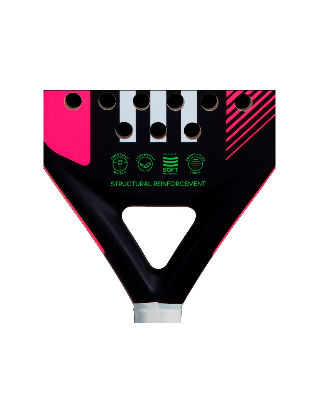 Il design della tomaia presenta una combinazione di colori sorprendenti nei toni del rosa e del nero, con l'iconico logo Adidas al centro. La racchetta include anche la tecnologia Smart Holes , che aiuta a migliorare la precisione nel colpire la palla.