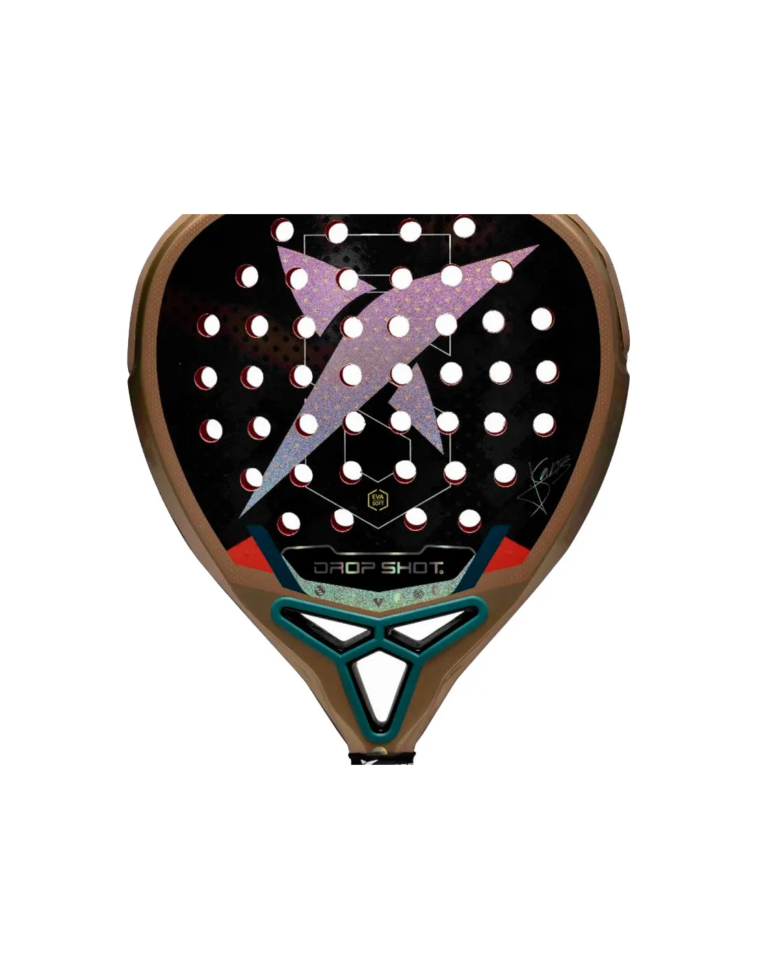 La sua forma a goccia e il bilanciamento medio-alto garantiscono un'eccellente velocità di uscita della palla e una potenza straordinaria nei colpi offensivi. Il nucleo in EVA Pro ad alta densità offre una sensazione di solidità e controllo, migliorando la stabilità e consentendo colpi più precisi e sicuri durante tutta la partita.