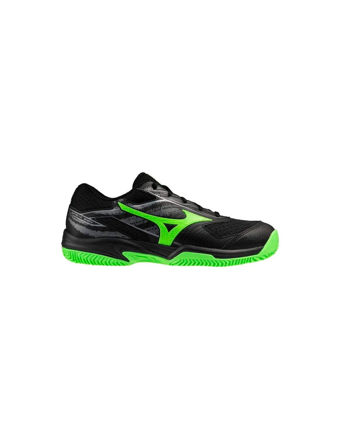 Le scarpe da padel Mizuno Break Shot 5 Clay, nei colori nero e verde, sono progettate per offrire massimo comfort, stabilità e aderenza sui campi in terra battuta. Ideali per i giocatori che cercano prestazioni e durata in ogni partita.