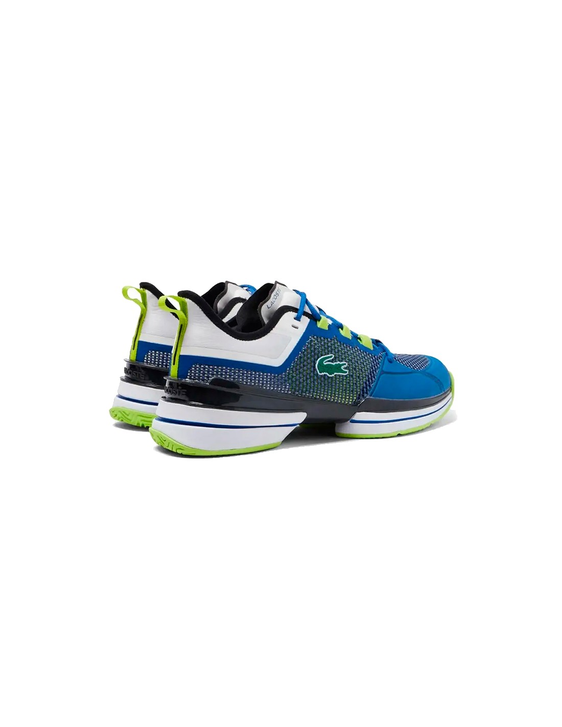La protezione Kurim nell'avampiede previene la torsione e la tecnologia Pebax nell'intersuola riduce l'affaticamento . Con pod Goodyear sulla base per supporto durante i cambi di velocità e punta testurizzata. Il design esterno, nei toni del nero, blu, bianco e rosso, include l'emblematico logo Lacoste sui lati esterni. Una scarpa che unisce stile e prestazioni in campo.