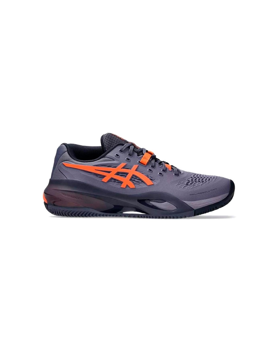 Asics Gel Resolution X Clay: prestazioni e comfort con tecnologia GEL, suola in argilla e design vivace in grigio, viola e arancione per giocare al meglio.