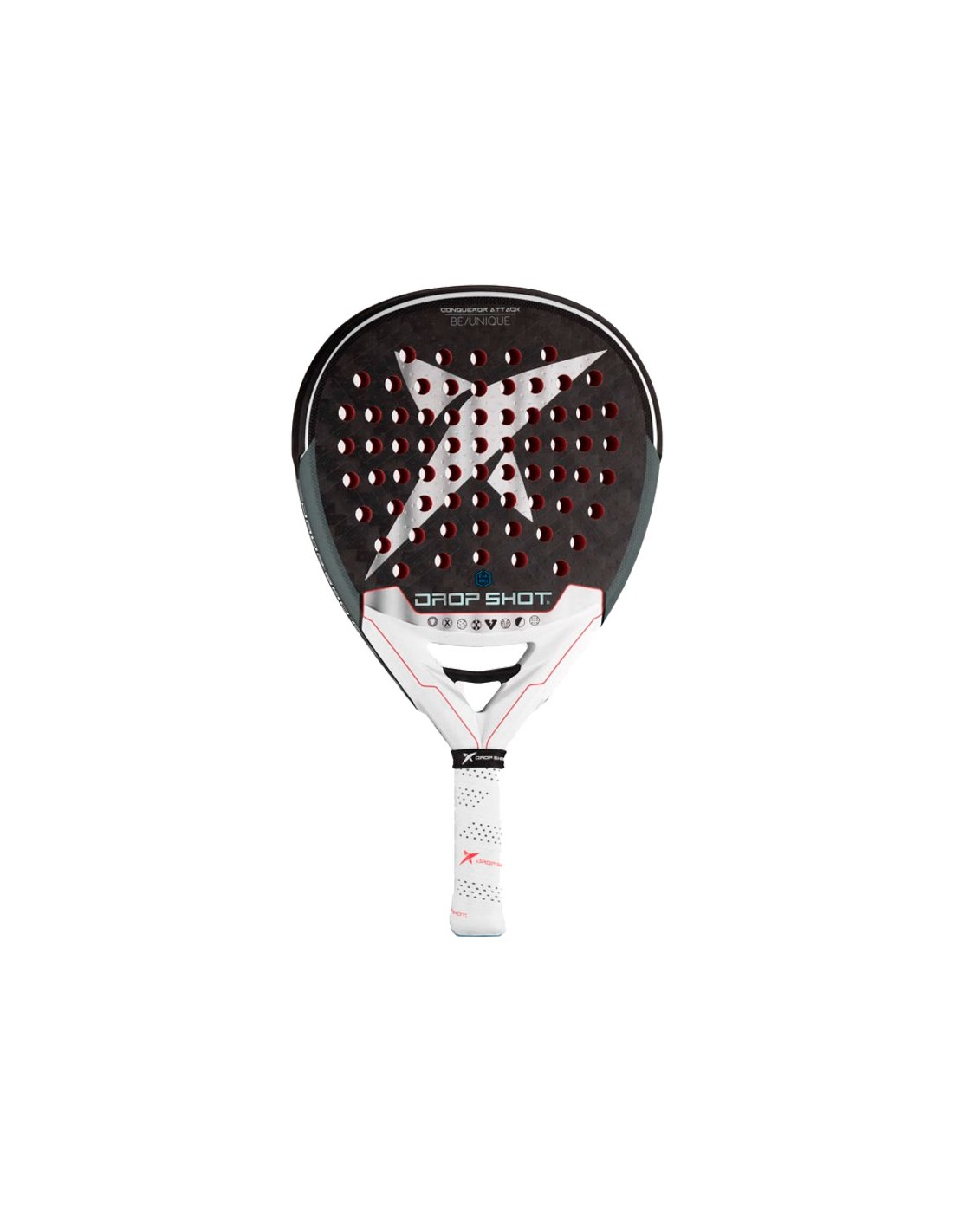 O coração da lâmina possui bordas para reduzir as vibrações e a viga central Power Beam Heart proporciona rigidez, durabilidade e resistência. O Sistema Twin Tubular no quadro de carbono garante homogeneidade e maior rigidez. Seu design, destacado pelas cores azul e vermelho, segue as tendências da estação, transformando a raquete de padel Drop Shot Conqueror Attack em uma raquete técnica e esteticamente impressionante. Experimente o padel ao mais alto nível com Drop Shot!