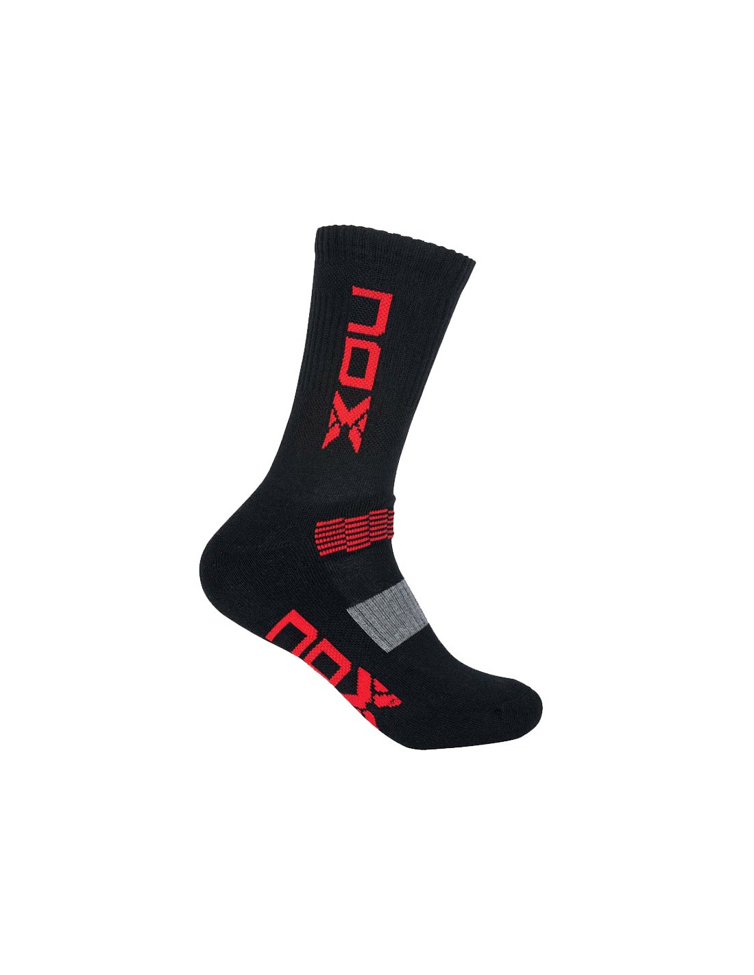 Meias técnicas Nox até a panturrilha, em preto e vermelho, projetadas para treinos intensos. Sua tecnologia avançada proporciona conforto, respirabilidade e durabilidade a cada uso.